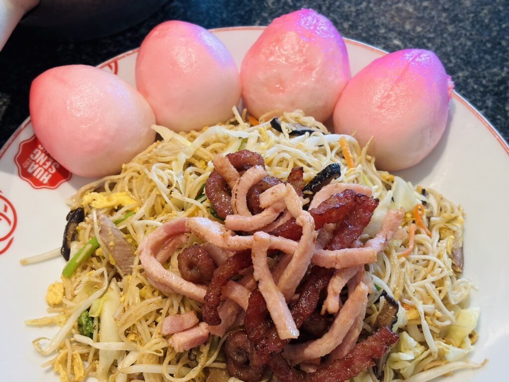 ตามด้วยจานหลัก หมี่ผัดอายุมั่นขวัญยืน เส้นเหนียวนุ่ม รสชาติกลมกล่อม เสิร์ฟคู่กับ ซิ่วท้อ 4 ลูก เพิ่มความหมายดีๆ เรื่องอายุยืนและความโชคดี