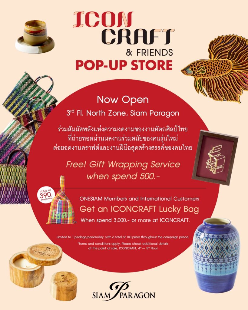 ไอคอนคราฟต์ (ICONCRAFT) พื้นที่แห่งแรงบันดาลใจ แหล่งรวมงานคราฟต์สร้างสรรค์จากช่างฝีมือไทยที่ใหญ่ที่สุด สานต่อความตั้งใจในการผลักดัน Local Heroes สู่ Global Heroes ส่งเสริมงานหัตถกรรมไทยร่วมสมัยให้กาวสู่ตลาดสากล ขยายแรงบันดาลใจแห่งงานฝีมือไทยสู่พื้นที่ใหม่ เปิด Pop–up Store ภายใต้คอนเซ็ปต์ “ICONCRAFT & FRIENDS” พื้นที่ที่ความคิดสร้างสรรค์มาบรรจบกับความเอื้อเฟื้อ นำแบรนด์คราฟต์จากทั่วประเทศ มาเผยเสน่ห์หัตถศิลป์ไทยในมุมมองร่วมสมัยสู่สายตาโลก ณ ชั้น 3 สยามพารากอน