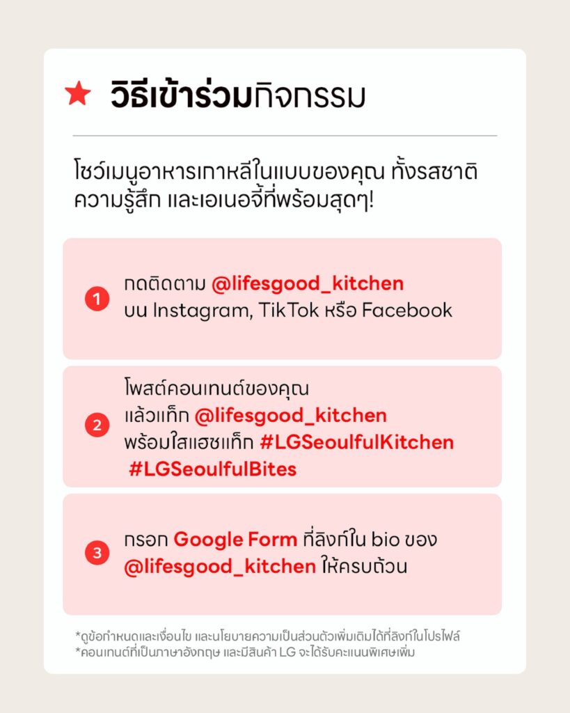 1. โพสต์วิดีโอสั้นหรือภาพถ่ายคอนเทนต์โชว์ฝีมือการทำอาหารเกาหลีในสไตล์ของคุณลงบน Instagram, TikTok หรือ Facebook ส่วนตัว โดยแท็ก@lifesgood_kitchen พร้อมติดแฮชแท็ก#LGSeoulfulKitchen และ #LGSeoulfulBites