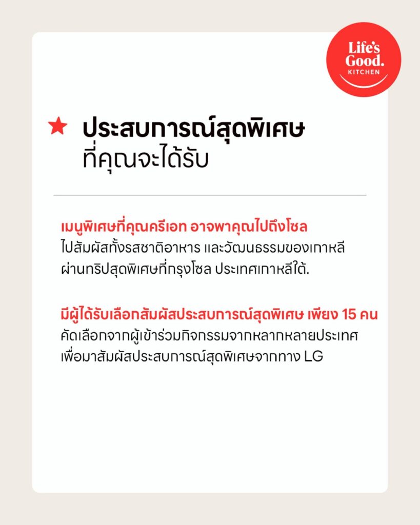 บริษัท แอลจี อีเลคทรอนิคส์(ประเทศไทย) จำกัด ผู้นำนวัตกรรมเทคโนโลยีเครื่องใช้ไฟฟ้าระดับโลกจากเกาหลี เปิดครัวต้อนรับเหล่า K-Food Lovers และครีเอเตอร์สายอาหารทั่วไทย ชวนปลดปล่อยความคิดสร้างสรรค์และโชว์สกิลการทำอาหารเกาหลีในแคมเปญ LG Seoul-ful Kitchen เพียงสร้างสรรค์และแชร์คอนเทนต์เมนูอาหารเกาหลีในสไตล์ของคุณเอง ไม่ว่าจะเป็นต๊อกบกกีรสชาติใหม่ คิมบับไส้สุดครีเอท หรือรามยอนสูตรเด็ดไม่เหมือนใคร เพื่อลุ้นเป็นผู้ชนะจากหลากหลายประเทศทั่วโลกรวม 15 ท่านที่จะได้บินลัดฟ้าสู่กรุงโซล สาธารณรัฐเกาหลี พร้อมรับสิทธิพิเศษมากมาย ไม่ว่าจะเป็น คลาสเรียนปรุงของอร่อยกับเชฟมืออาชีพ ทัวร์โชว์รูมเทคโนโลยีเครื่องครัวล้ำสมัย และตระเวนชิมร้านดังระดับตำนาน โดยสามารถร่วมสนุกได้ตั้งแต่วันนี้ ถึง 8 พฤษภาคม 2569