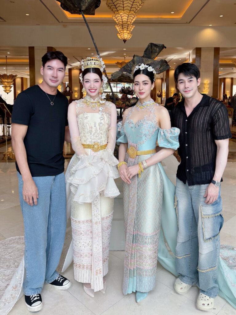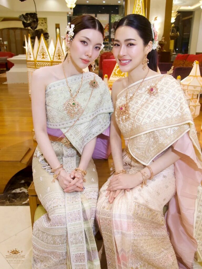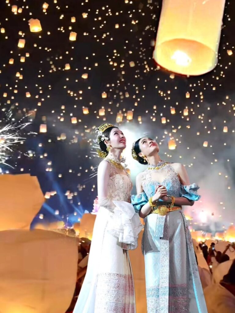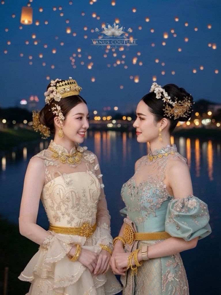 หลิงหลิง มาในลุคชุดโทนชมพู–ครีม อ่อนหวาน หรูหรา และละเมียดละไม สะท้อนประกายอิ่มเอมราวแสงโคมดวงน้อยที่ลอยเรียงรายบนท้องฟ้า ดีเทลลายทอไทยและงานปักละเอียด ถ่ายทอดความอ่อนโยนและความงดงามของหญิงสาวในวันพิเศษได้อย่างสมบูรณ์ออม มาในลุคชุดโทนเขียวตองอ่อนละมุนตา ถ่ายทอดเสน่ห์แห่งธรรมชาติและความอ่อนช้อยของผืนใบตอง แฝงความสง่างามดุจแสงจันทร์ต้องผิวน้ำใน