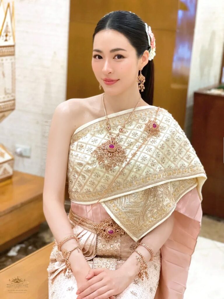 ออม มาในลุคชุดโทนครีมทองแชมเปญ เปล่งประกายดั่งแสงเทียนในค่ำคืนยี่เป็ง เสริมความหรูหราด้วยแขนระบายชั้นลูกไม้ฝรั่งเศส และลายปักดอกบุษบาประดับไข่มุกละเอียดประดุจกลีบดอกไม้ยามต้องแสงไฟระยิบของโคมลอย