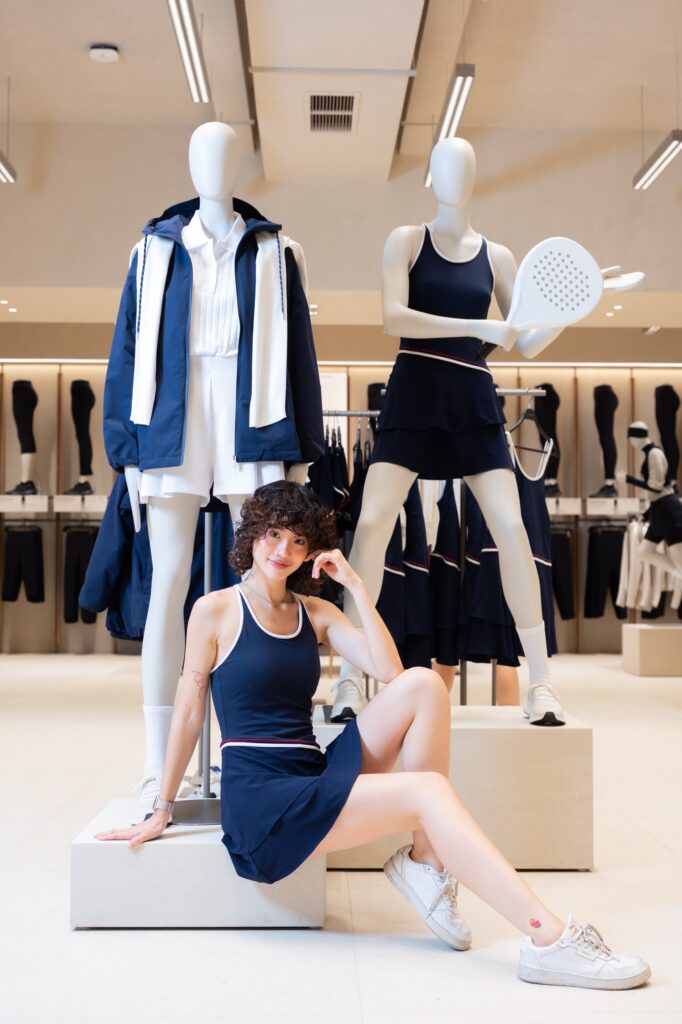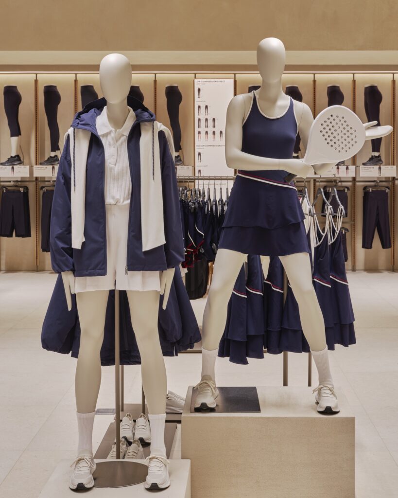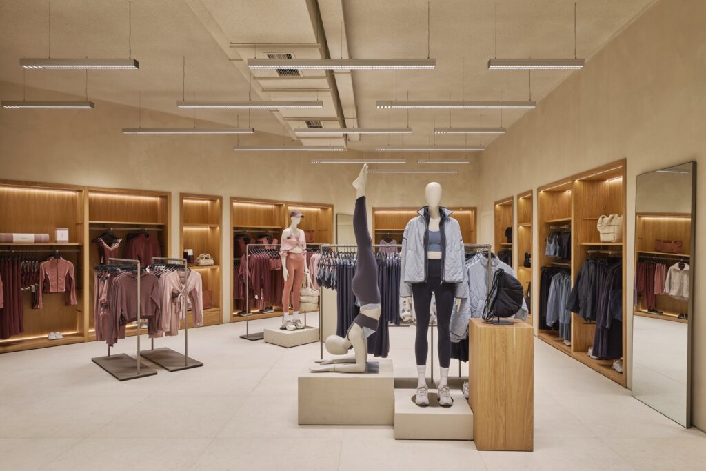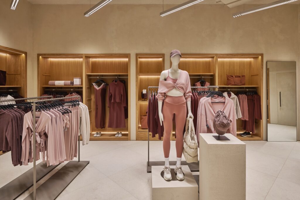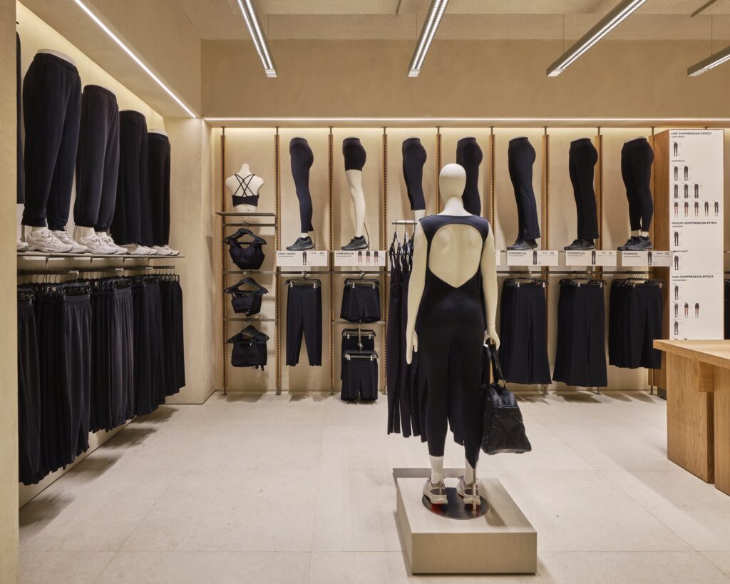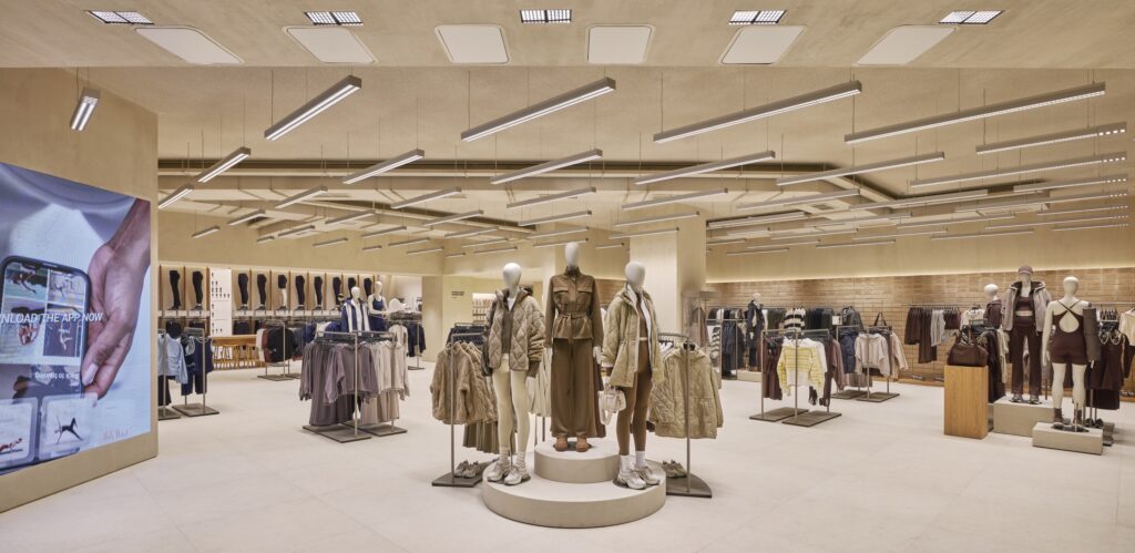 ด้านโครงสร้างสถาปัตยกรรมและวัสดุ ความอบอุ่น ผิวสัมผัสจากธรรมชาติ และแสงสว่าง คือองค์ประกอบสำคัญ ภายในร้านจึงเลือกใช้เป็นพื้นกระเบื้องพอร์ซเลนเพื่อให้เข้ากับวัสดุที่คัดสรรมาอย่างพิถีพิถัน โซนต้อนรับโดดเด่นด้วยผนัง earth-block งานแฮนด์คราฟต์ สะท้อนตัวตนของแบรนด์และชูภาพลักษณ์ความเป็นแบรนด์ผู้นำเทรนด์ Athleisure ตั้งแต่ก้าวแรกที่เข้าสู่ร้าน