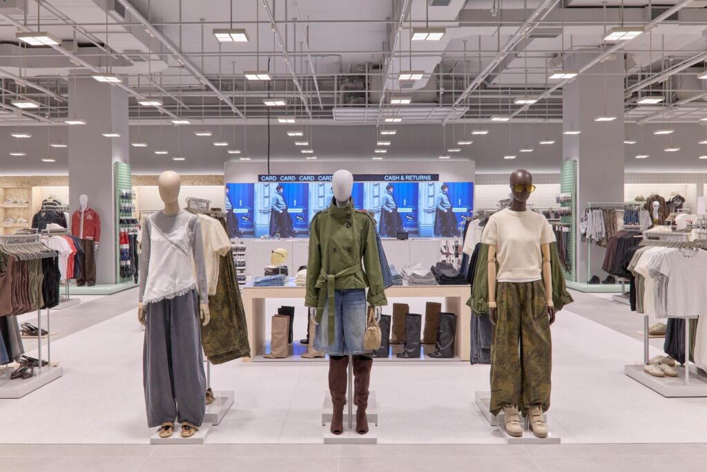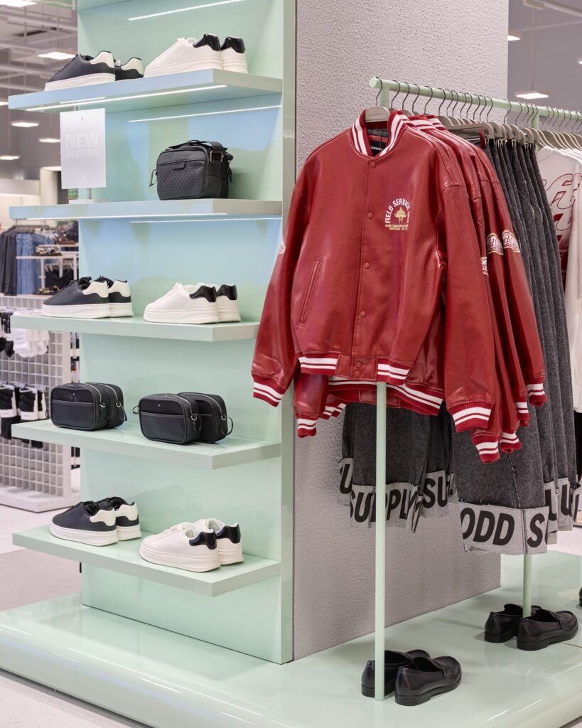 ในส่วนของพื้นที่ให้บริการลูกค้า ห้องลองสินค้า และเคาน์เตอร์ชำระเงิน ได้รับการออกแบบอย่างพิถีพิถัน เนื่องจากเป็นองค์ประกอบสำคัญของประสบการณ์ภายในร้าน โดยโซนชำระเงินถูกออกแบบเป็นชิ้นงานไม้เชิงประติมากรรมในลักษณะบล็อกขนาดใหญ่ จัดวางเสมือนเกาะที่โดดเด่นภายในพื้นที่ พร้อมรองรับทั้งเคาน์เตอร์ชำระเงินแบบปกติและแบบบริการตนเอง ช่วยเพิ่มความคล่องตัวในการใช้งาน ส่วนพื้นที่ห้องลองสินค้า ถูกออกแบบให้มีโครงสร้างส่วนกลางที่โอบล้อมพื้นที่ทั้งหมด กลายเป็นองค์ประกอบที่มีเอกลักษณ์และโดดเด่นทางสายตา สร้างภาพจำให้กับร้านได้อย่างชัดเจน