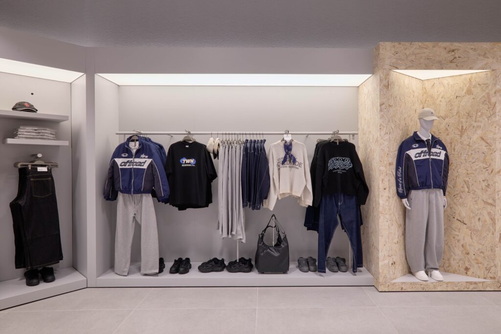 บริเวณภายในร้านถูกออกแบบและจัดวางผังพื้นที่เป็นโซนต่างๆ อย่างชัดเจน เพื่อรองรับการจัดแสดงคอลเลคชันที่หลากหลายอย่างเป็นระบบ โดยมีการเลือกใช้วัสดุที่แตกต่างกันในแต่ละโซน อาทิ ไม้เนื้อคุณภาพ พื้นผิวเซรามิก พื้นผิวเคลือบแลคเกอร์สีต่างๆ และพื้นผิวที่ให้สัมผัสคล้ายหิน ทั้งหมดอยู่ภายใต้โทนสีเทาเป็นหลัก เพื่อช่วยขับเน้นสีสันที่สดใสของเสื้อผ้าให้โดดเด่นยิ่งขึ้น และช่วยให้ลูกค้าสามารถเลือกชมสินค้าได้อย่างสะดวกสบายตลอดการเลือกซื้อสินค้า